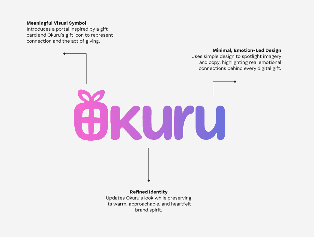This concept refines Okuru’s identity while keeping its warm and approachable spirit. The main visual element - a portal inspired by both a gift card and Okuru’s gift icon - symbolizes connection and the heartfelt exchange between giver and receiver. A simple, minimal layout lets imagery and copy shine, making the emotion behind each interaction clear.